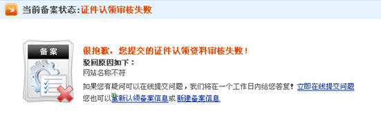 通過(guò)證件認(rèn)領(lǐng)主體時(shí),提交的相關(guān)證件經(jīng)萬(wàn)網(wǎng)審核失敗