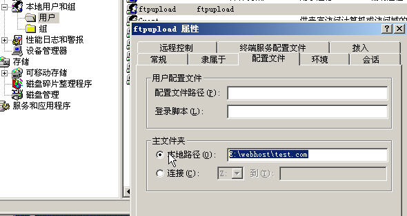 建立帳號(hào),并修改主文件夾路徑為你指定的目錄(指定的目錄必需要有此用戶的"完全控制"訪問權(quán)限,權(quán)限可以在目錄上右擊--->屬性里修改). | |