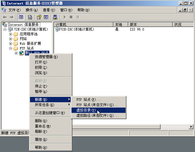 開始--->程序--->管理工具--->IIS信息管理器 打開IIS管理工具.展開FTP站點(diǎn),在"默認(rèn)FTP站點(diǎn)上右擊--->新建"虛擬目錄" | |
