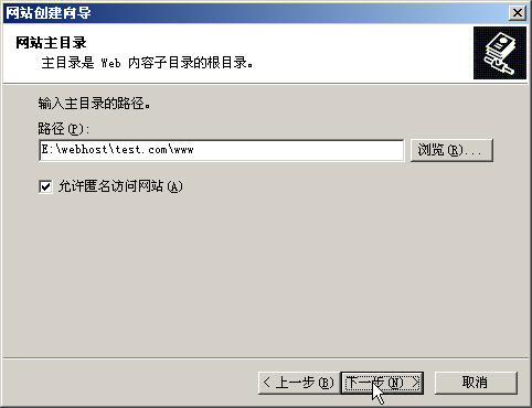 | 1. | 接上一個(gè)例子,我們假設(shè)你已經(jīng)把網(wǎng)站源文件用ftpupload這個(gè)FTP傳到了E:\webhost\test.com\www目錄下,那么我們可以建立這個(gè)網(wǎng)站了. | |