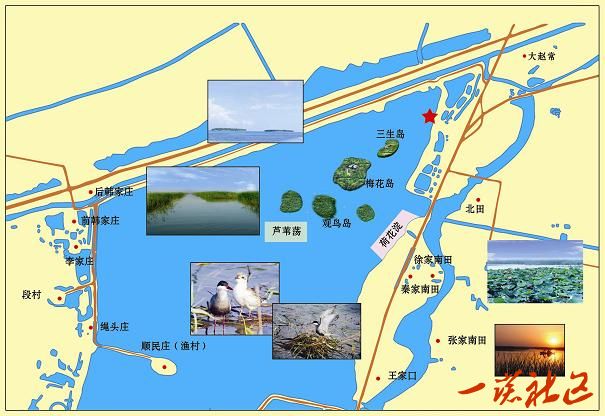 碼頭、三生島、梅花島、觀鳥島、蘆葦蕩、荷花淀、漁村、碼頭
